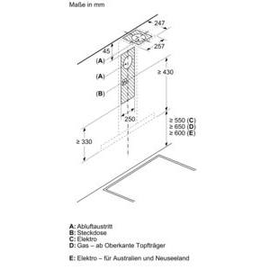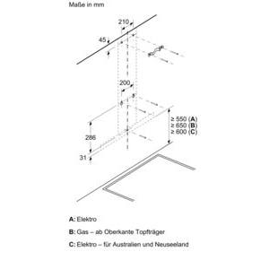 Technisches Schema einer Dunstabzugshaube mit Maßangaben in Millimeter. Verschiedene Modelle (A, B, C) sind dargestellt.